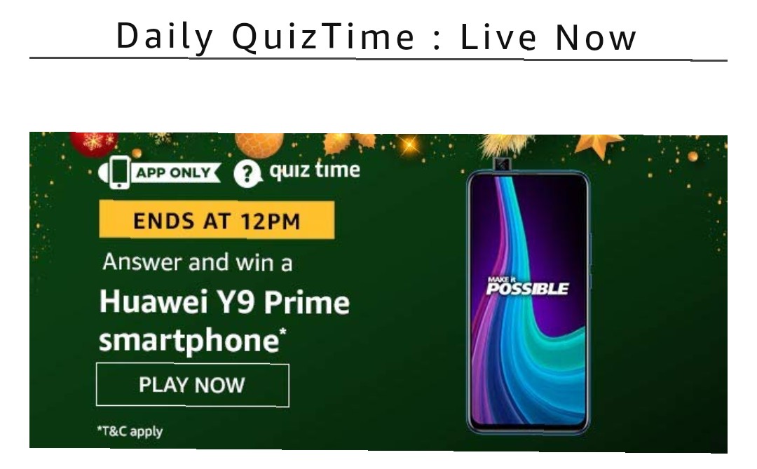 AMAZON TODAY QUIZ – 18 DECEMBER | TODA’S PRIZE – Huawei Y9 Prime Smartphone